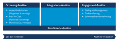 Es ist wichtig die verschiedenen Konzepte zu verstehen. Die folgende Abbildung zeigt eine Kategorisierung der Ansätze. Unterschieden wird häufig, ob ein ESG-Ansatz vor bzw. nach einem Investitionsentscheid greift. Vor einem Investitionsentscheid liegt das Augenmerk auf der aus ESG-Absicht richtigen Auswahl der Investitionen. Danach liegt es auf der Einflussnahme auf die investierten Unternehmen.