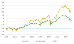 Die folgende Grafik zeigt die Wertentwicklung für ein Konto, eine Anlagestrategie mit 50% Aktien (Strategie Ausgewogen) und eine Anlagestrategie mit 100% Aktien (Aktien-Strategie) seit 2015 auf. Trotz des turbulenten Börsenjahrs 2022 und den damit verbundenen Kursrückschlägen konnte das Vermögen mit Wertschriftenanlagen gegenüber dem Sparkonto deutlich vermehrt werden.
