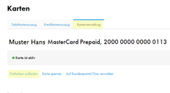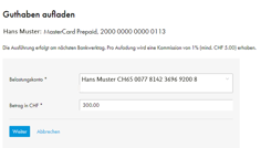 Klicken Sie unter «Meine LUKB > Kartenverwaltung» und wählen Sie Ihre Prepaid-MasterCard an. Sie erhalten die Option «Guthaben aufladen». Um die Aufladung zu bestätigen, bitten wir Sie das Belastungskonto sowie den Betrag auszuwählen.