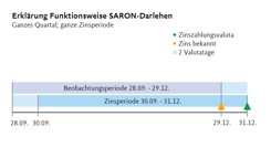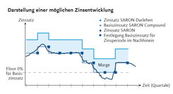 Für die Zinsberechnung wird als Basiszinssatz der sogenannte SARON Compound herangezogen. Dieser berechnet sich aus dem durchschnittlichen aufgezinsten SARON und ist gegenüber der Zinsperiode aber um 2 Valuta-Tage verschoben. Er wird während der Zinsperiode täglich ermittelt.