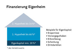 Um ein Haus oder eine Wohnung zu kaufen, müssen Sie über Eigenkapital verfügen. Als Regel gilt: 20% des Kaufpreises muss von der Käuferschaft in Form von Eigenkapital beigesteuert werden. Der restliche Betrag kann über eine Hypothek finanziert werden.