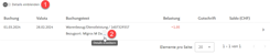 Im Kontoauszug haben Sie die Möglichkeit, die Detailangaben anzeigen zu lassen. Dies können Sie einerseits mittels Button «Details einblenden» über alle Kontoauszüge hinweg vornehmen (siehe Screenshot Punkt 1) oder bei einzelnen Buchungen mittels Klick auf die drei Punkte (siehe Screenshot Punkt 2).